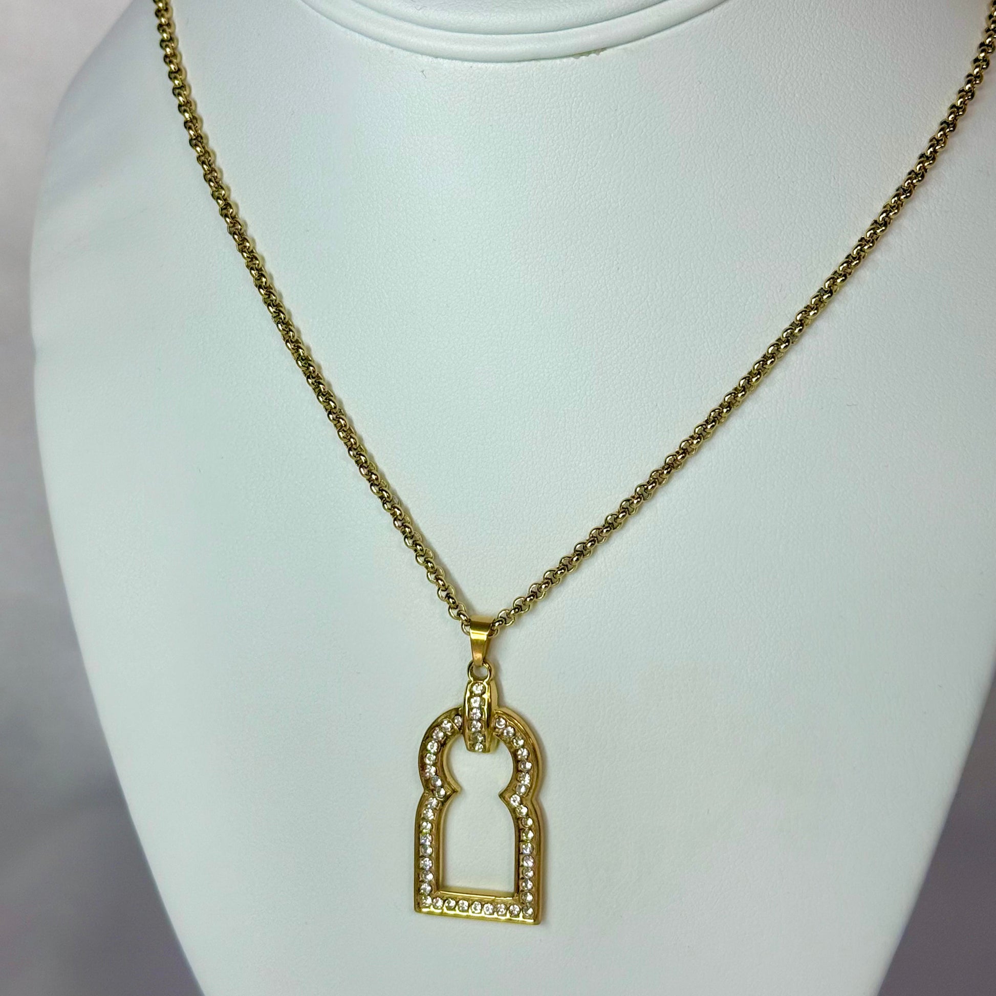 Inspired by the timeless elegance of Moroccan architecture, the Bab Al Qamar Necklace features a delicate pendant shaped like a keyhole arch a signature element found in grand riads and palaces.