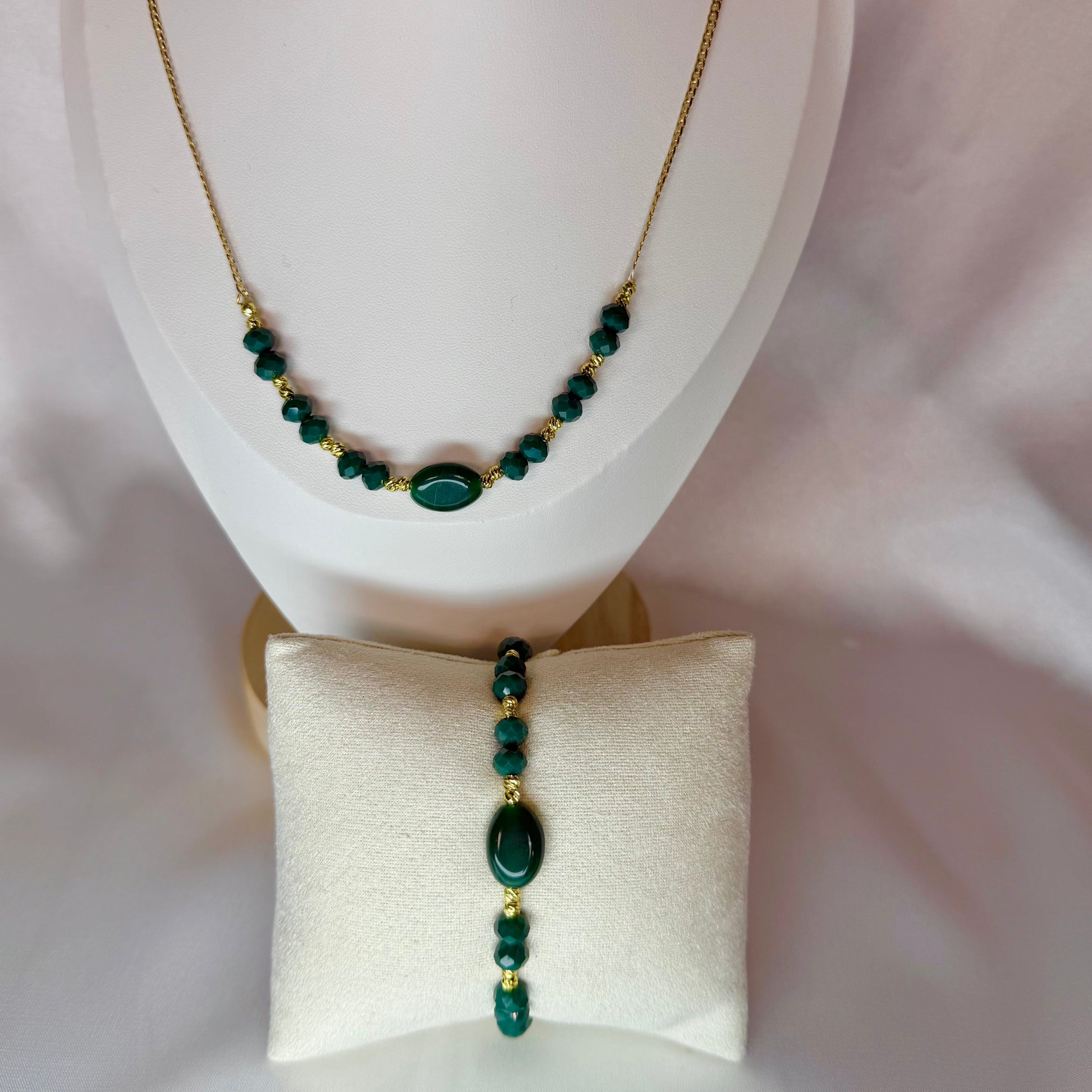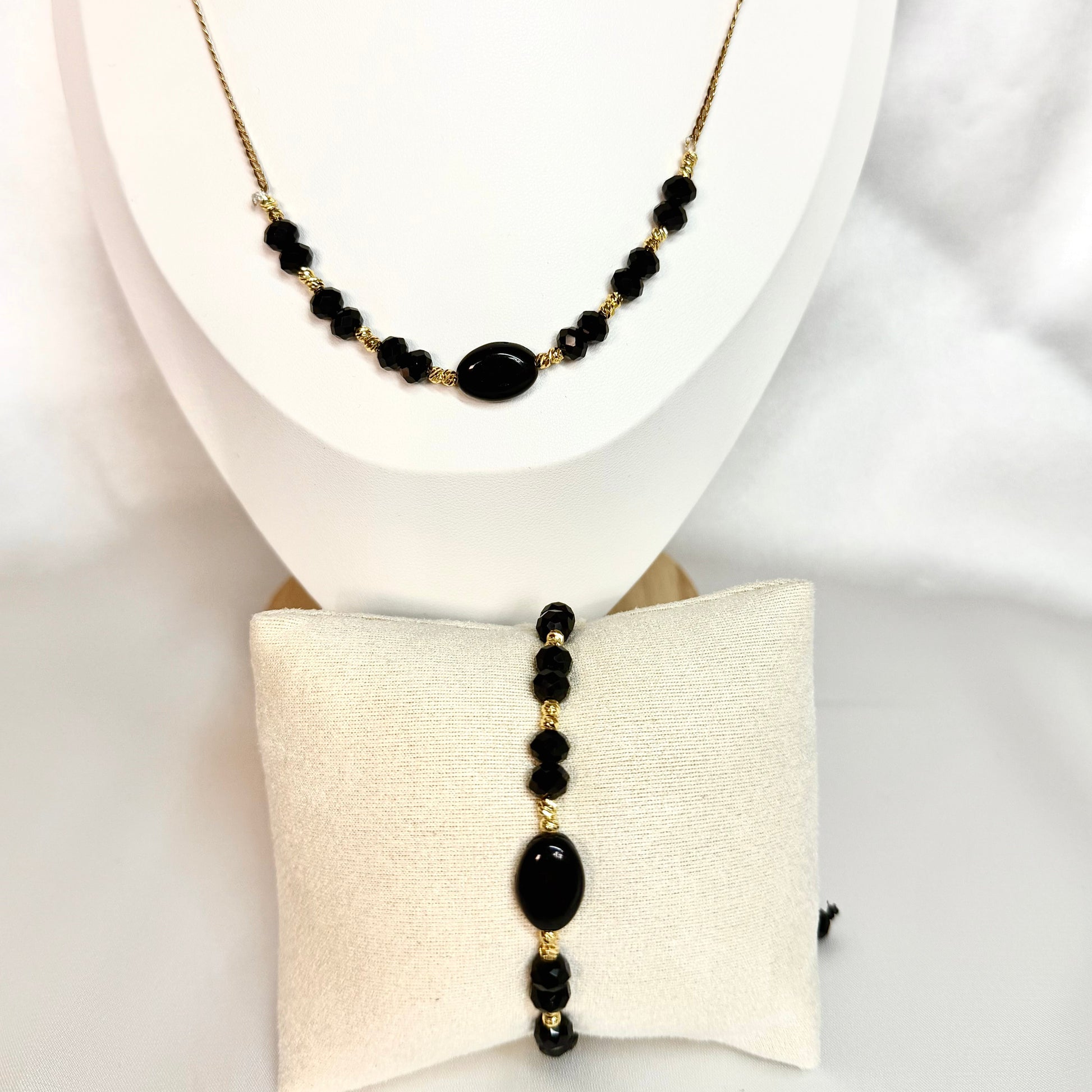 Each set features a delicate beaded necklace paired with a matching bracelet, designed with faceted gemstone-style beads and gold-tone accents for a radiant finish. At the center lies a smooth, oval gemstone bead that anchors the design with understated charm.