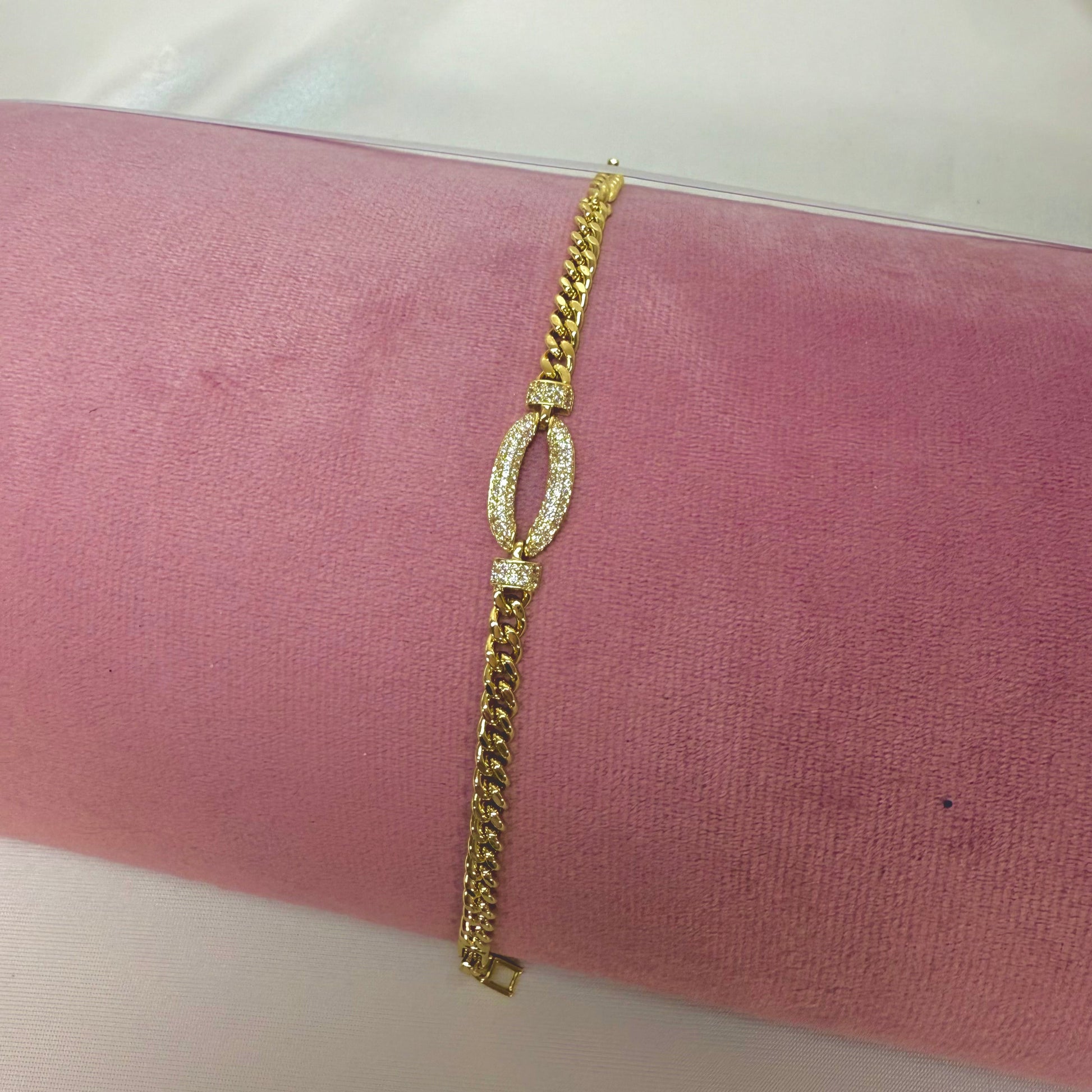 Crafted with a classic gold curb chain, it features a center oval link encrusted with sparkling pavé crystals, creating a stunning focal point. This timeless piece is perfect for stacking with other bracelets or wearing solo for a sophisticated statement.