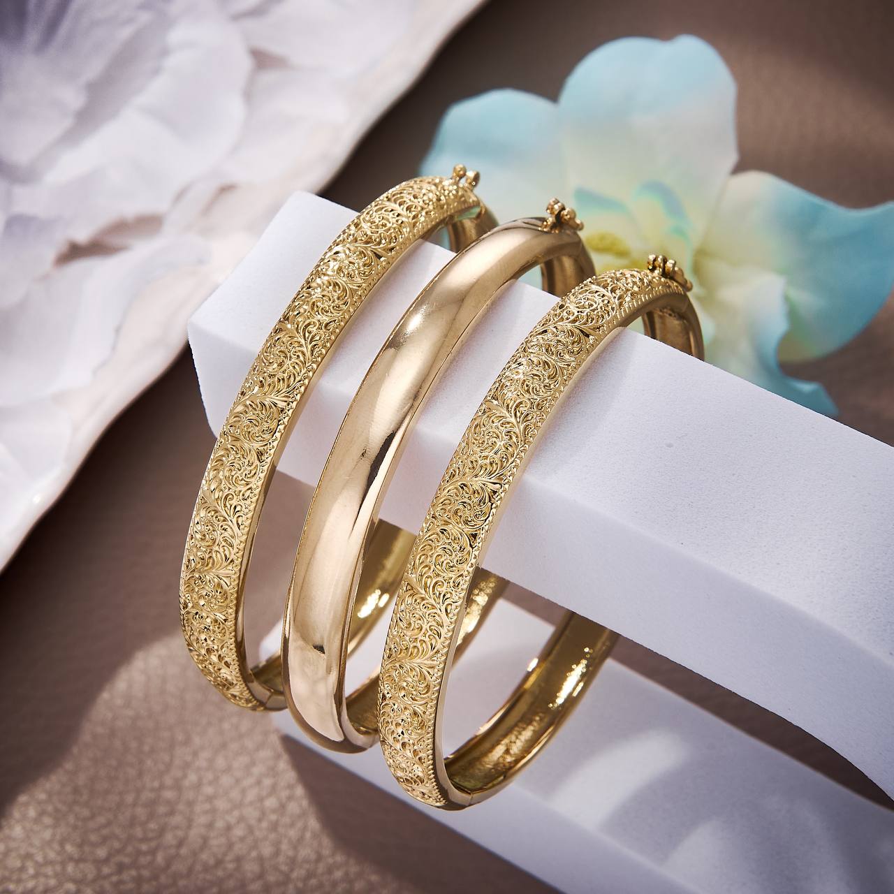 Crafted in 18K gold plating, this set includes one sleek, polished bangle for a clean classic touch and two intricately engraved bangles inspired by traditional craftsmanship.