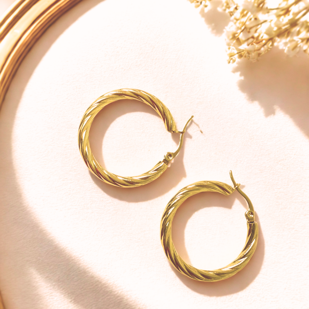 A classic pair of twisted gold hoops designed with a smooth, polished finish. These lightweight earrings add the perfect touch of elegance to any look and are ideal for everyday wear.