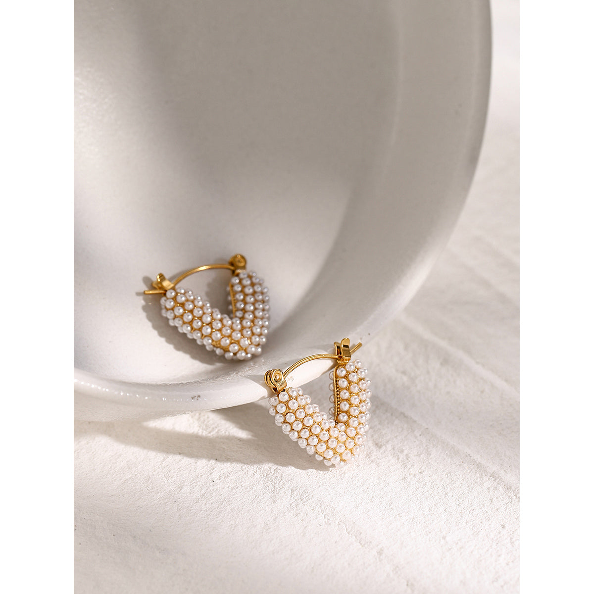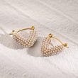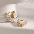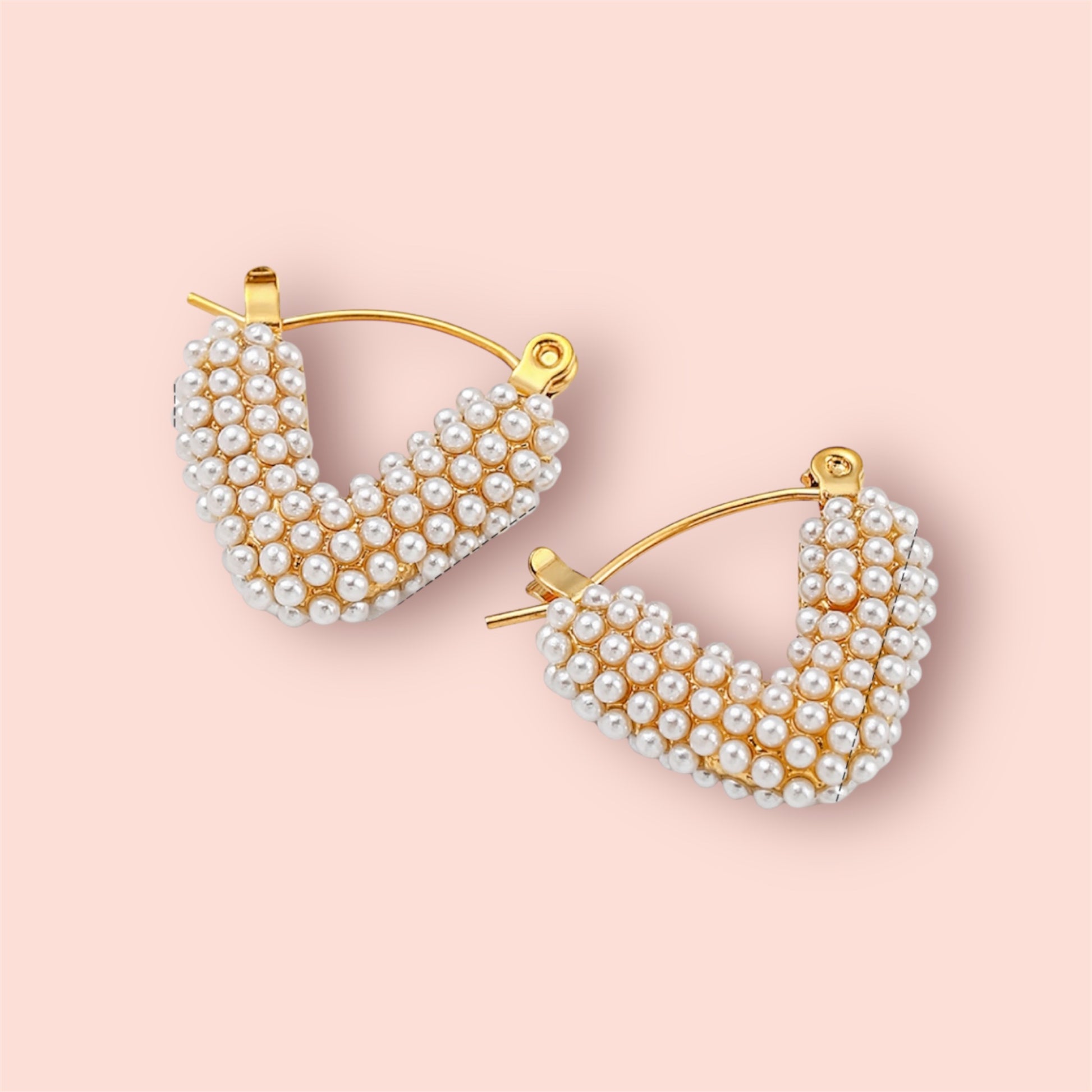 Add a touch of sophistication to your look with these stunning 18K gold-plated V-shaped hoop earrings, adorned with lustrous faux pearls for a bold yet elegant statement. The unique pave pearl design offers a modern twist on classic hoops, making them perfect for both everyday glam and special occasions.